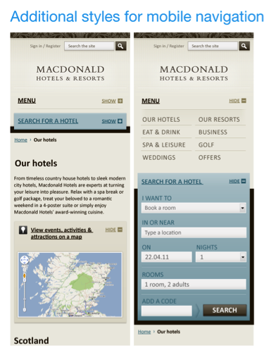 相比于傳統(tǒng)的Web視覺設(shè)計(jì)過程,在這里我們不僅要打造出風(fēng)格恰當(dāng)?shù)腢I元素,而且要根據(jù)前面制定下來的幾種規(guī)格方案,對某些關(guān)鍵性的UI元素進(jìn)行樣式擴(kuò)展或改造。例如下圖所示的酒店搜索模塊,正如我們前面提到的,在小屏幕版本中,最佳實(shí)踐方式是做成可展開和收起的模式,而這種交互方式在平板電腦或桌面設(shè)備中是不需要的。類似這樣情況,在視覺設(shè)計(jì)方面需要花些額外的功夫。