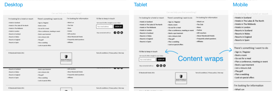 接下來我們需要考慮的是,每一列中的模塊組件應(yīng)該以怎樣的方式隨著頁面的寬度縮放而響應(yīng)式的適應(yīng)和調(diào)整。在這個過程里,保持團(tuán)隊(duì)成員之間的溝通是非常重要的,包括視覺設(shè)計(jì)師、前端開發(fā)人員等;使用初步的線框原型,與大家交流模塊組件在布局和樣式方面的調(diào)整計(jì)劃,盡量在初期就讓相關(guān)成員對整個規(guī)劃做到心中有數(shù),并盡早發(fā)現(xiàn)前端實(shí)現(xiàn)等方面的潛在的問題。
