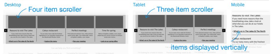 全局的四列等寬網(wǎng)格布局使其他組件的規(guī)劃也非常輕松。在首頁中有一個組件,其中包含若干內(nèi)容模塊。默認(rèn)尺寸下,可以并排顯示四個模塊;左右兩邊各有一個觸發(fā)滾動的按鈕,以點(diǎn)擊之后模塊列表會前后滾動,以顯示更多內(nèi)容。在平板電腦類型的布局中,默認(rèn)顯示的數(shù)量變?yōu)槿齻€;而在手機(jī)的小尺寸屏幕中,內(nèi)容模塊列表會變?yōu)閱瘟校⑷サ袅擞糜谧笥覞L動的按鈕,用戶可以上下滾動頁面,依次查看不同的模塊。