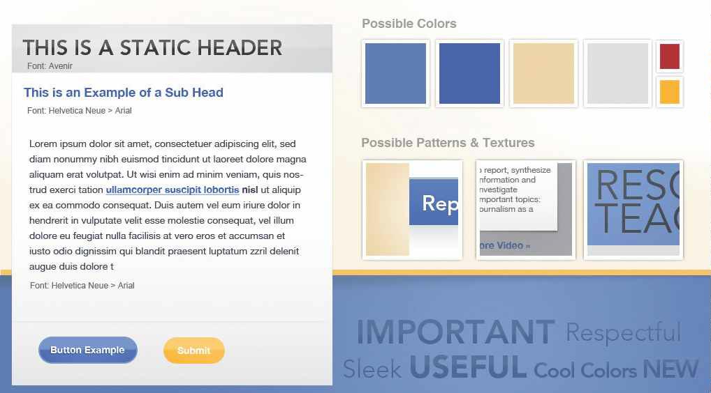 介紹網(wǎng)站所使用的文字排印方案,包括字體風(fēng)格、選取這些字體的理由等。這里還要通過(guò)一些具有代表性的具體圖示來(lái)介紹字體風(fēng)格與頁(yè)面上下文環(huán)境之間的關(guān)系。