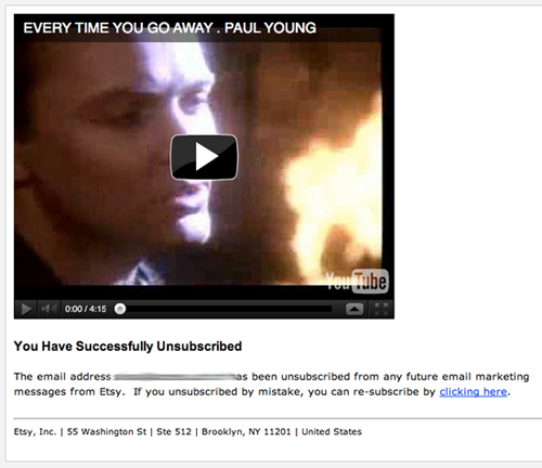 Etsy 會在用戶退訂之后播放Paul Young的"Every Time You Go Away"。這種方式無法讓用戶留下來,但可以給他們留下深刻的印象。當(dāng)用戶再一次在Etsy平臺上瀏覽商品時,多半會想起這個有意思的小環(huán)節(jié),或許他們無論在哪里聽到這首歌的時候還會想到Etsy呢。