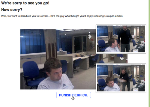 這方面最經(jīng)典的案例莫過于Groupon的著名段子,"懲罰Derrick"。雖然這個過場發(fā)生在用戶確認(rèn)退訂之后,但它通過真實的人物以及鋒利而又自嘲的幽默,切實拉近了用戶與網(wǎng)站之間的距離。在這個多多少少會使退訂用戶產(chǎn)生內(nèi)疚的段子之后,Groupon還會再慫恿用戶重新進行訂閱。雖然你清楚的知道這是他們玩的小伎倆,但在如此具有代入感的段子面前,多數(shù)用戶會覺得非常有趣,正面情緒和狀態(tài)完全被調(diào)動起來。