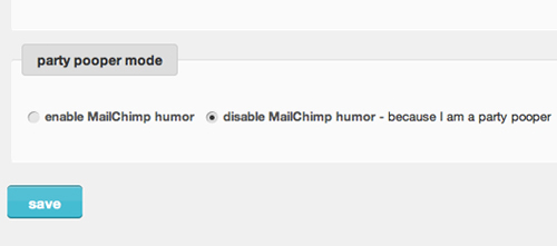 再次以MailChimp為例,他們提供了一種“party掃興模式”,那些對幽默風(fēng)格不感冒的用戶可以在這里禁用那些有意思的設(shè)計元素。