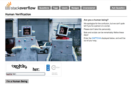 驗證工具Captcha在如今被很多網(wǎng)站所使用,但這不意味著用戶真的喜歡這東西,很多時候Captcha確實會令人感到煩惱和挫敗。我們暫時無法改變這個工具本身的工作機制,但至少可以像Stack Overflow那樣通過一幅有趣的圖片搭配說明文案,向用戶解釋為什么要使用這個煩人的工具,籍此獲得用戶的理解,減少負(fù)面情緒的產(chǎn)生。