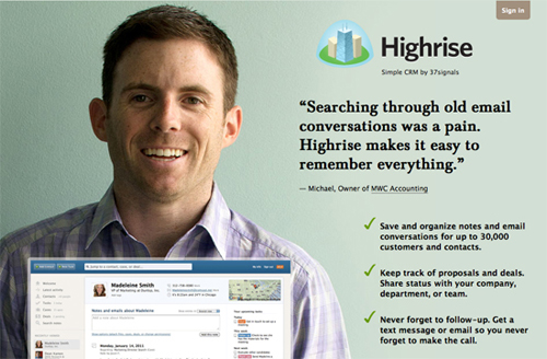 通過這張圖片,Highrise 向我們展示了一個快樂的人,還有他使用該公司產(chǎn)品的故事。來自實際客戶的微笑以及贊許之辭,這是非常正面的、非常容易促使?jié)撛谟脩粽J(rèn)同并期望獲取其產(chǎn)品的宣傳形式。