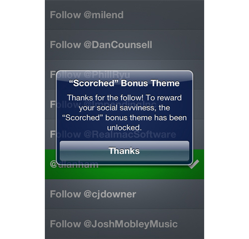 驚喜、專享 :在應(yīng)用中打開主題設(shè)置界面后,安裝了Tweetbod的用戶會收到一條消息,恭喜他們獲得了專享的額外主題。這些用戶很可能因為受到了特殊照顧而感到開心,另外,這個群體在口碑傳播方面的作用是相當(dāng)大的。
