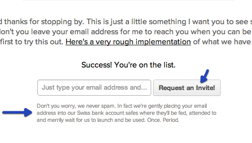 下面的范例來自我的一個個人項目,用戶需要邀請碼才可以試用這個產(chǎn)品。在提交申請的地方,我使用“我要獲取邀請!”來代替?zhèn)鹘y(tǒng)的“提交”作為按鈕當(dāng)中的文案,希望這可以調(diào)動起用戶的情緒,并使他們感受到一種更加真實、更加有針對性的互動。另外我也起草了一份簡單的說明文案,讓用戶放心,我們絕不會發(fā)送垃圾郵件。