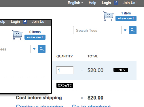 Threadless 的購物車在沒有商品放入時會呈現(xiàn)出憂傷的表情,反之則會表現(xiàn)的非常開心。這樣的小細(xì)節(jié)會讓你覺得平凡而有趣,甚至?xí)挥勺灾鞯男ζ饋怼<词褂脩糇罱K沒有產(chǎn)生購物行為,他們也會記住這個可愛的購物車。