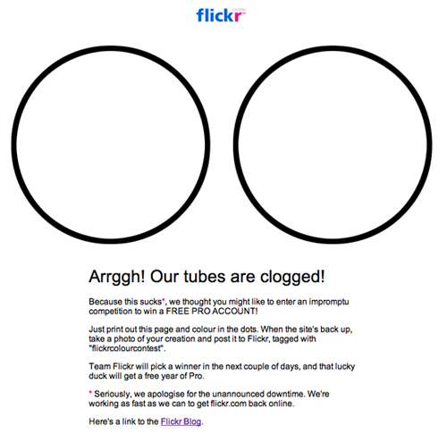 同樣來自于Flickr的案例。當(dāng)系統(tǒng)發(fā)生了一些更加嚴(yán)重的問題時,他們會告訴用戶:“額,我們的管道堵塞了!”,然后使用非常口語化的文案表示了歉意。除此之外,他們還為用戶設(shè)置了一個小任務(wù),也就是將當(dāng)前頁面打印出來,為兩個圓環(huán)填色,然后拍下來,等到站點恢復(fù)正常后傳到Flickr上;Flickr團隊會挑選出優(yōu)勝者,向他們贈送一年的高級帳號。