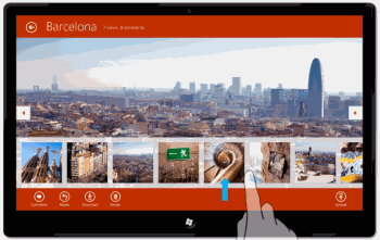 無論在iOS還是Windows中,這兩個(gè)手勢在很多時(shí)候都被用作放大或縮小內(nèi)容對(duì)象的尺寸。不過對(duì)于Metro應(yīng)用來說,它們還可以通過Semantic Zoom來實(shí)現(xiàn)內(nèi)容層級(jí)間的導(dǎo)航。用戶可以捏合某個(gè)內(nèi)容對(duì)象,來進(jìn)入它所在的相關(guān)內(nèi)容組。不過,當(dāng)用戶正在以全屏模式瀏覽單張相片的時(shí)候,捏合與張開的手勢還是會(huì)被用來調(diào)整圖片的尺寸。