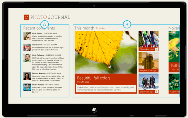 在iPad應(yīng)用中,設(shè)計(jì)師通常需要考慮兩種屏幕定向方式以及對(duì)應(yīng)的界面設(shè)計(jì)方案。而Windows 8可以運(yùn)行在多種設(shè)備上,包括平板和臺(tái)式機(jī)。因此,我們要考慮到顯示空間更大的情況,讓用戶在大尺寸設(shè)備中能夠看到更多的內(nèi)容。網(wǎng)格布局可以使設(shè)計(jì)方案更好的適應(yīng)于不同的屏幕定向方式及不同類型的顯示設(shè)備,例如針對(duì)縱向空間更大的設(shè)備來顯示更多的當(dāng)月特色圖片。
