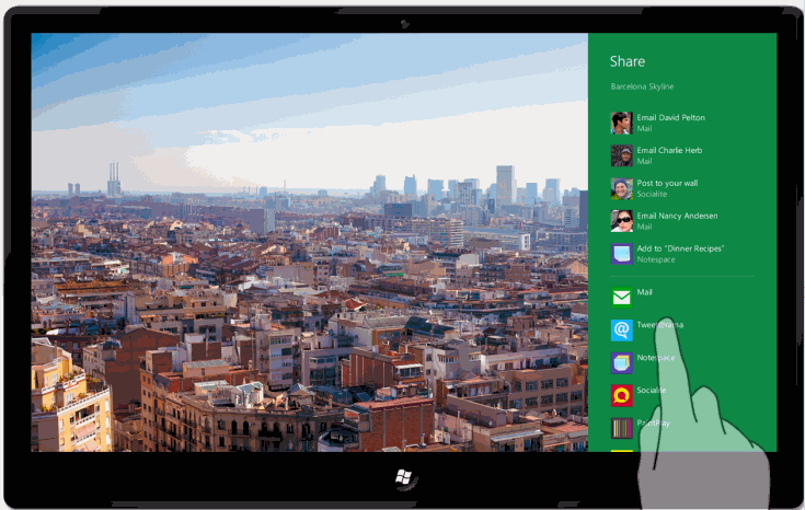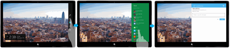 而在Metro風(fēng)格的應(yīng)用當(dāng)中,我們會(huì)使用分享契約 。這種技術(shù)方案簡化了設(shè)計(jì)與開發(fā)方面的工作,因?yàn)槲覀儾恍枰獮橛脩粲锌赡苡玫降纳鐣?huì)化服務(wù)而將它們與每個(gè)單獨(dú)的應(yīng)用都逐一整合起來。不僅是社會(huì)化服務(wù),用戶還可以將信息保存共享至平臺(tái)上所有那些使用了分享契約的應(yīng)用,而開發(fā)者們則無需擔(dān)心外部服務(wù)的接口問題。站在用戶的角度,他們可以在charms bar這個(gè)固定的地方完成有關(guān)分享的操作。