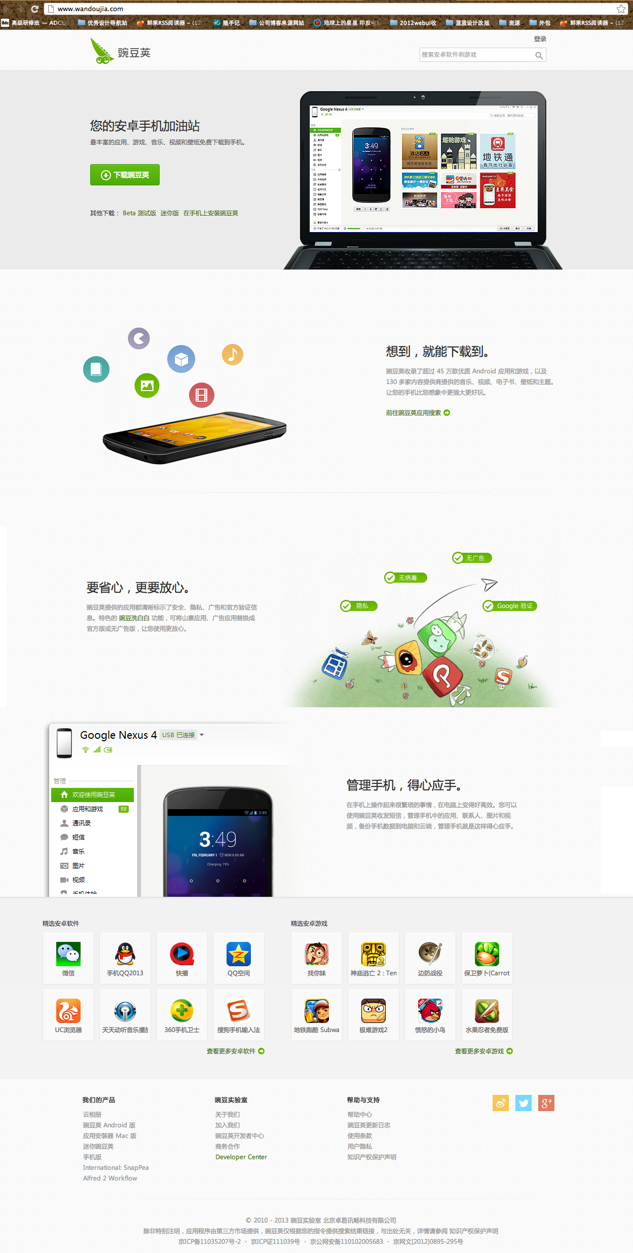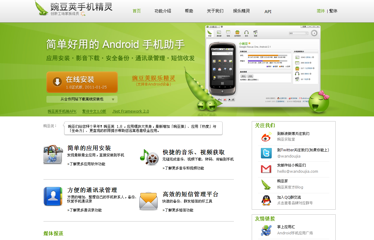 6改版后的豌豆莢手機(jī)精靈官網(wǎng)http://www.wandoujia.com/,極簡(jiǎn)主義,該突出的重點(diǎn)“軟件界面圖片”更大更顯眼,去掉了任何多余的東西,下載按鈕顯的更萬(wàn)灰眾中一點(diǎn)綠,更易找到,增加轉(zhuǎn)化率。