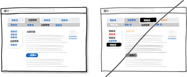 諸如顏色,層次及模塊間的對(duì)比這些視覺(jué)上的設(shè)計(jì)可以很好地幫助用戶(hù)使用產(chǎn)品:他時(shí)刻知道當(dāng)前所處的頁(yè)面以及可以轉(zhuǎn)到哪些頁(yè)面。要傳達(dá)這樣一個(gè)好的界面,你就需要將可點(diǎn)擊的元素(比如連接,按鈕),可選擇的元素(比如單選多選框)以及普通的文字明顯區(qū)分開(kāi)來(lái)。在下圖的例子中,我將點(diǎn)擊操作的元素設(shè)置為藍(lán)色,選中的當(dāng)前元素為黑色。這樣適當(dāng)?shù)脑O(shè)計(jì)可以讓用戶(hù)很方面地在產(chǎn)品的各模塊間切換。但千萬(wàn)不要把這三種元素設(shè)計(jì)得混亂不堪。