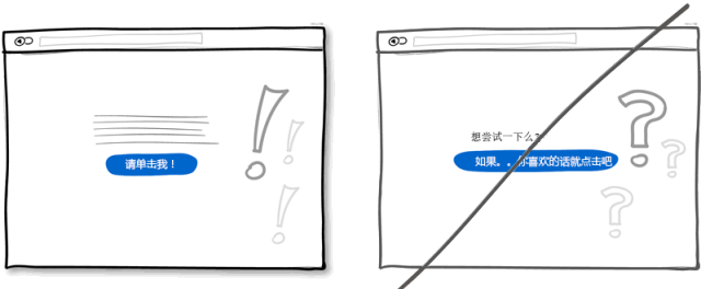 你可以通過(guò)不確定而顫抖的聲音來(lái)表達(dá)傳遞自己的意思,當(dāng)然也可以通過(guò)很自信的方式表達(dá)。如果你在界面中的表述用語(yǔ)多以問(wèn)號(hào)結(jié)束,比如"也許","可能","感興趣?" 或者"想要試試么?",那么你完全還可以把語(yǔ)氣變得更堅(jiān)定一些。不過(guò)萬(wàn)事無(wú)絕對(duì),或許適當(dāng)放松措詞讓用戶(hù)有自行思考的余地也是可以的。
