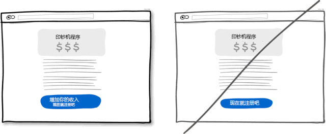 試想界面上有這樣兩個(gè)按鈕:一個(gè)是"獲取折扣",另一個(gè)是"立即注冊(cè)"。我敢打賭大多數(shù)人會(huì)點(diǎn)擊第一個(gè),因?yàn)榈诙€(gè)按扭讓人感覺(jué)不到有利可圖,并且"注冊(cè)"讓人聯(lián)想到填不完的表單。也就是說(shuō)讓用戶(hù)感受到獲利的按鈕更有可能被點(diǎn)擊。這種讓用戶(hù)感到好處的文字信息也可放在按鈕旁邊,不一定要做為按鈕的標(biāo)題。當(dāng)然,正常的按鈕還是有用處的,一般用于重復(fù)性操作頻繁的地方。