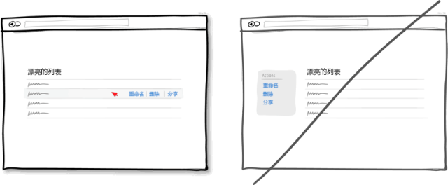 不用說(shuō)直接在元素身上進(jìn)行操作是更直觀明了的方式。比如在一個(gè)列表中,我們想讓用戶(hù)對(duì)每個(gè)條目進(jìn)行操作那么就把按鈕放到當(dāng)前條目上,而不要把放到列表之外。再比如就是直接點(diǎn)擊元素就進(jìn)入編輯狀態(tài)(比如頁(yè)面上的地址信息點(diǎn)擊后可以進(jìn)行編輯)。這種方式比傳統(tǒng)的選中再點(diǎn)擊相應(yīng)的按鈕進(jìn)行操作要簡(jiǎn)潔省事得多。當(dāng)然,對(duì)于一般性的操作本身就不需要有什么上下文的,就沒(méi)必要這么做了,比如頁(yè)面上的前進(jìn),后退按扭。