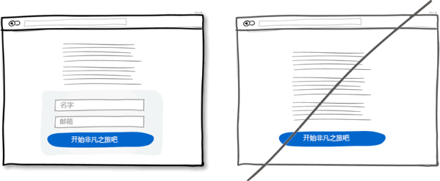 在一個(gè)足夠大的寬屏界面上最好還是直接給出表單,這比點(diǎn)擊按鈕再?gòu)棾霰韱我煤芏?。首先減少了點(diǎn)擊操作,流程變得簡(jiǎn)潔也節(jié)省了時(shí)間。其次,直接呈現(xiàn)出表單可以讓用戶(hù)知道表單有多長(zhǎng),其實(shí)也是在告訴用戶(hù)注冊(cè)花不了多少時(shí)間。當(dāng)然,這條規(guī)則適合注冊(cè)表單非常簡(jiǎn)單的情況。