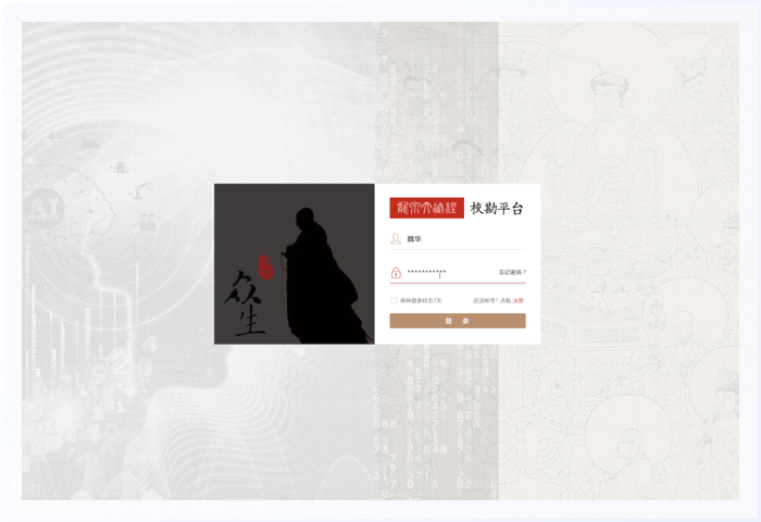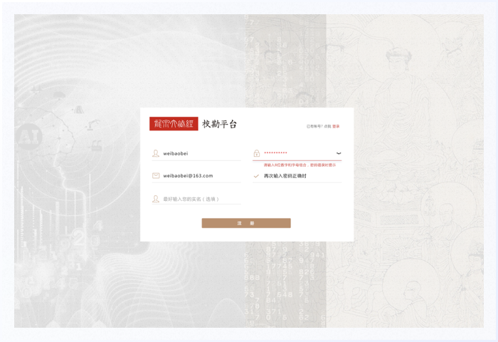 注冊(cè)頁是登錄頁的延伸頁面,可以與登錄頁互相切換。使用古典藏經(jīng)圖案作為背景,上面疊加內(nèi)容卡片且居中分布,在整體視覺上符合產(chǎn)品調(diào)性,在操作上完善各種輸入狀態(tài)的反饋。