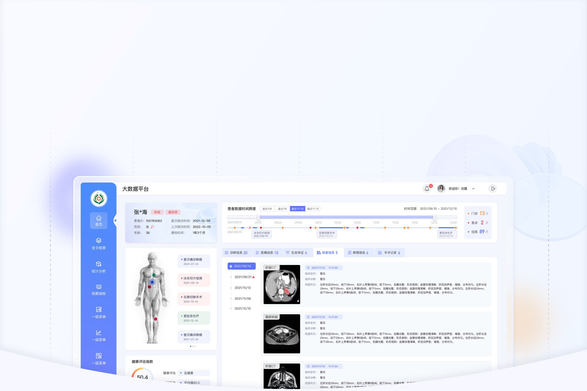 核心數(shù)據(jù)突出顯示-原來首頁沒有登錄人員信息,并且 [患者人數(shù)]、T病例份數(shù)]、手術(shù)臺數(shù),等數(shù)據(jù)每個占據(jù)一個大框顯示頁面顯得空洞,通過整合增加登錄人員信息以及歡迎語,使整個頁面更有親和力,一些相關(guān)數(shù)據(jù)采用卡片疊加的形式展示,不能可以增加整個頁面的靈動感,并且把登錄人員的相關(guān)信息緊密關(guān)聯(lián)起來