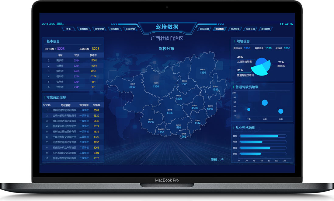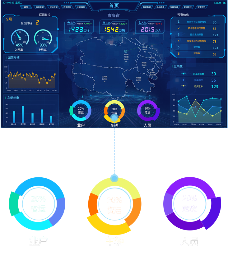 行業(yè)態(tài)勢展示了道路交通運輸行業(yè)的基礎(chǔ)數(shù)據(jù)和走勢,實時反映行業(yè)的運行狀態(tài),將采集的數(shù)據(jù)形象化、直觀化、具體化。為了加強某些重點工作,我們還需加入“聯(lián)網(wǎng)聯(lián)控”、“互聯(lián)互通”等相關(guān)專題。系統(tǒng)所具備的數(shù)據(jù)管理能力可將現(xiàn)有的數(shù)據(jù)進行有效的整合,快速準確地提供報表并提出決策依據(jù)。