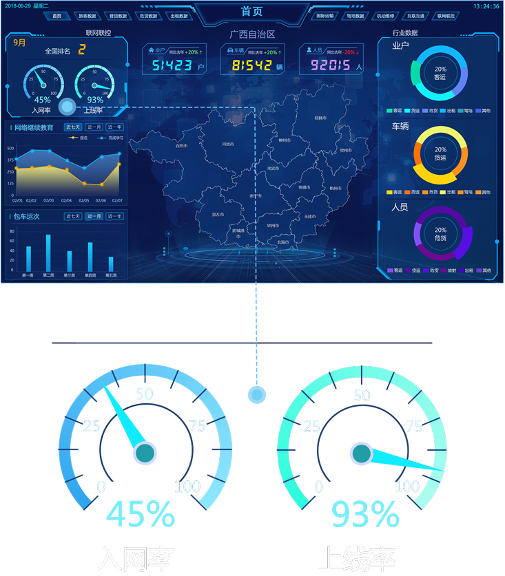 儀表盤:入網(wǎng)率和上線率用儀表盤的形式來展示,整體增加了整個頁面的科技感。兩個儀表盤 分別采用藍、青兩種比較亮的顏色同是也有輕微的漸變。儀表盤沒有全部封閉,下邊由數(shù)字顯示當 前具體的百分比。